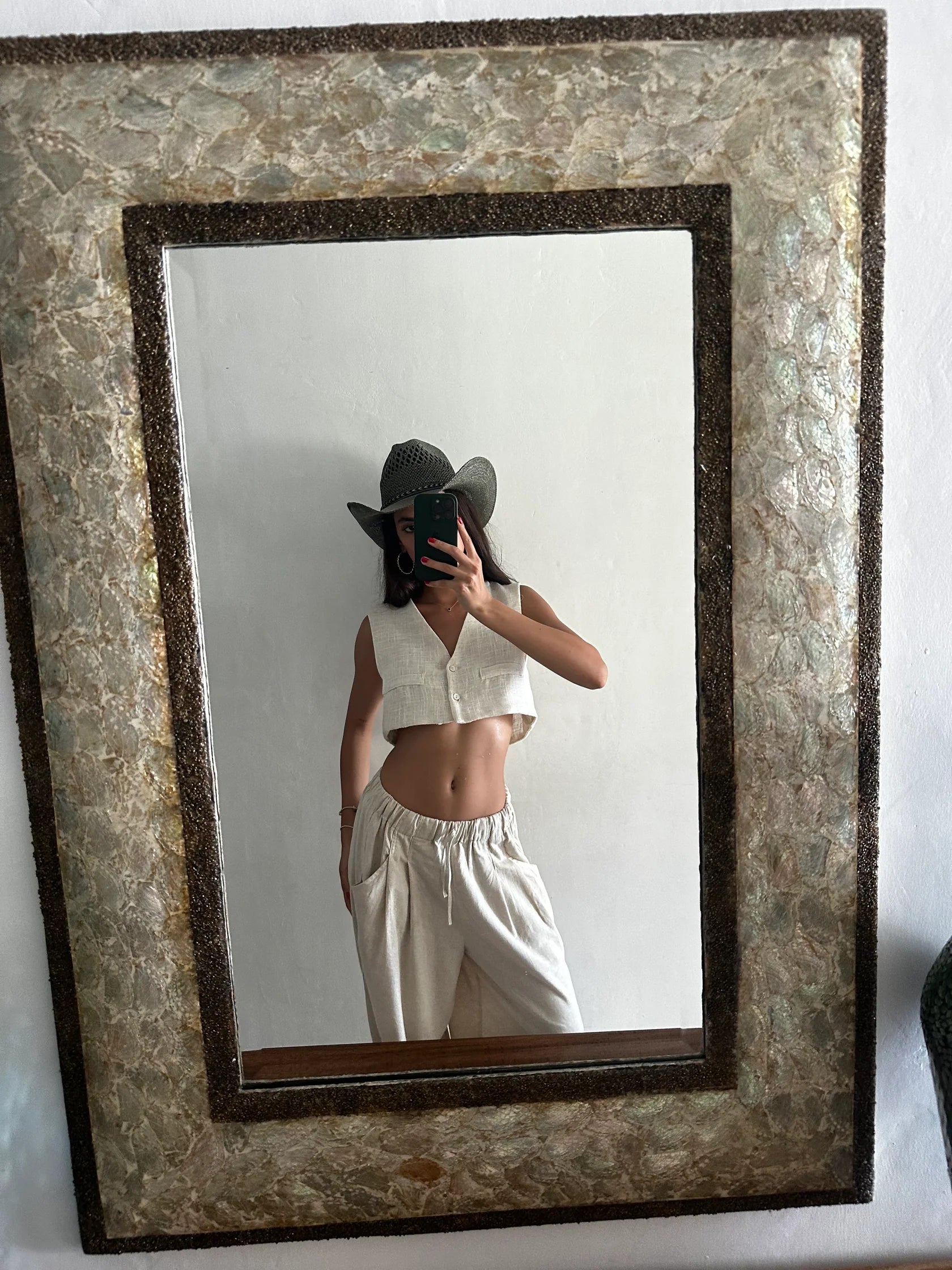Crop Top estilo chaleco, en lino artesanal, cuello en V con botones frontales, corte recto