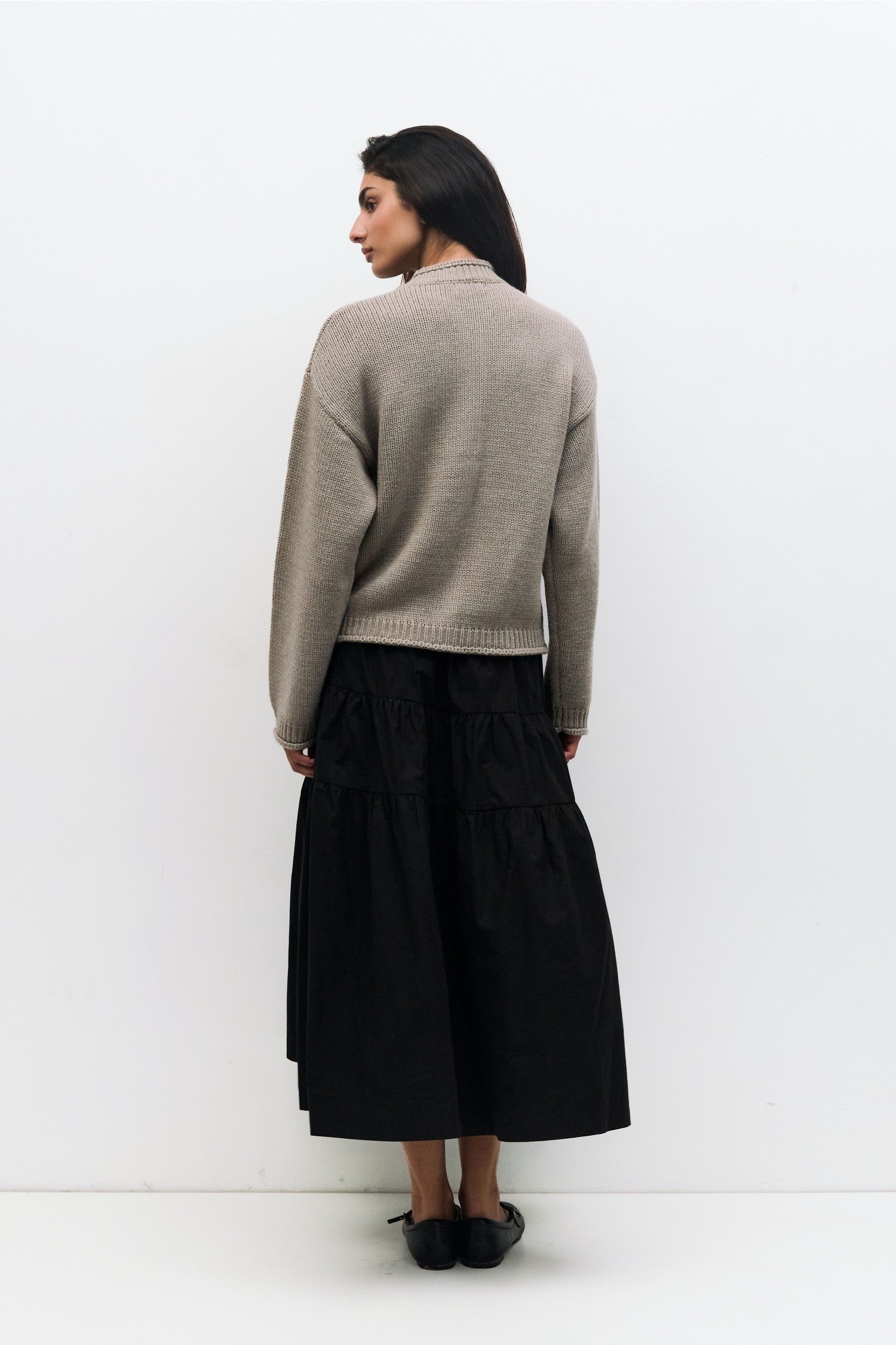 Esta falda presenta un diseño midi fruncido con filas escalonadas y una silueta amplia que facilita el movimiento. Confeccionada en popelina de algodón ligero, incluye cinturilla elástica y cierre de cremallera lateral parcial para un ajuste cómodo y seguro.