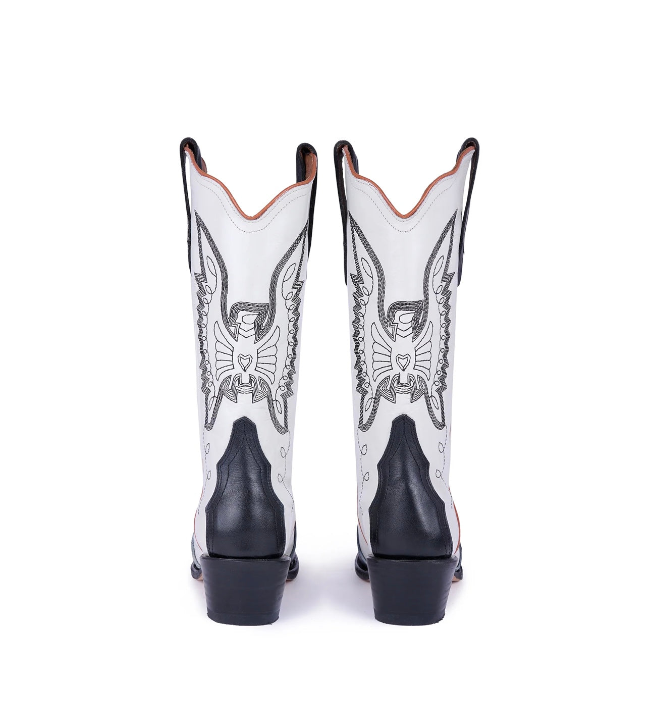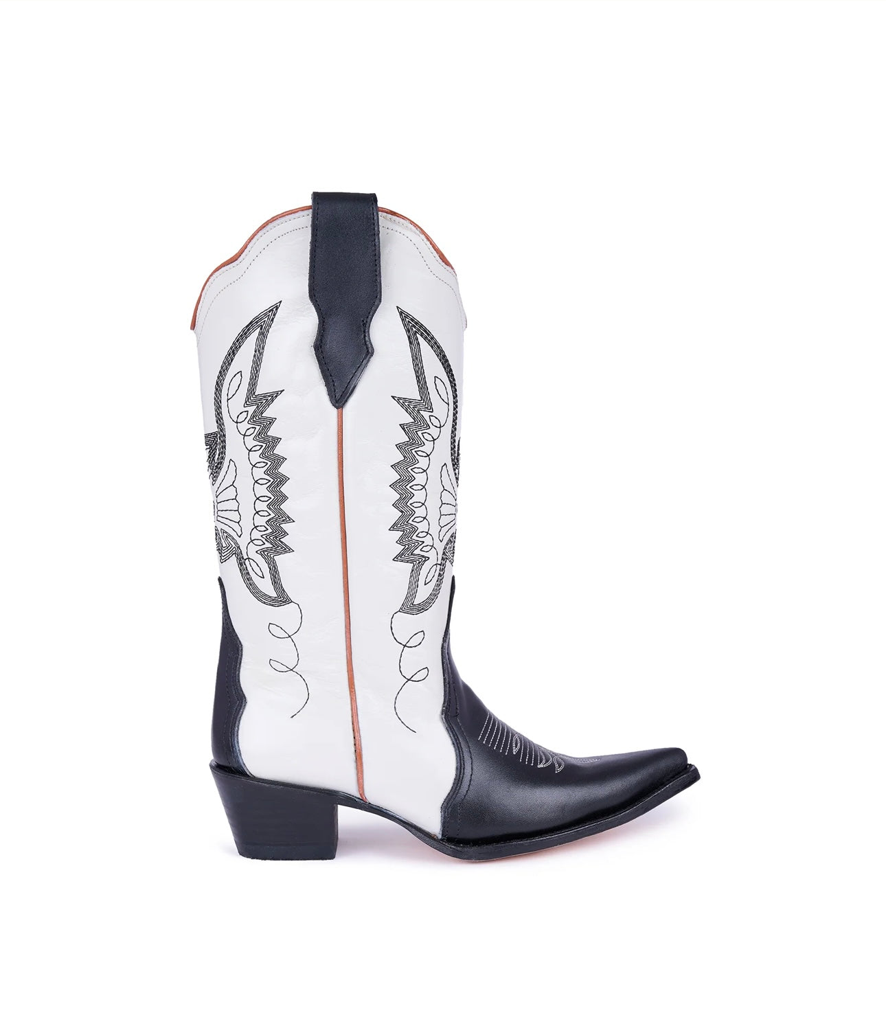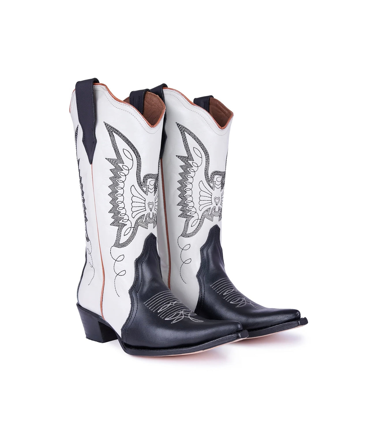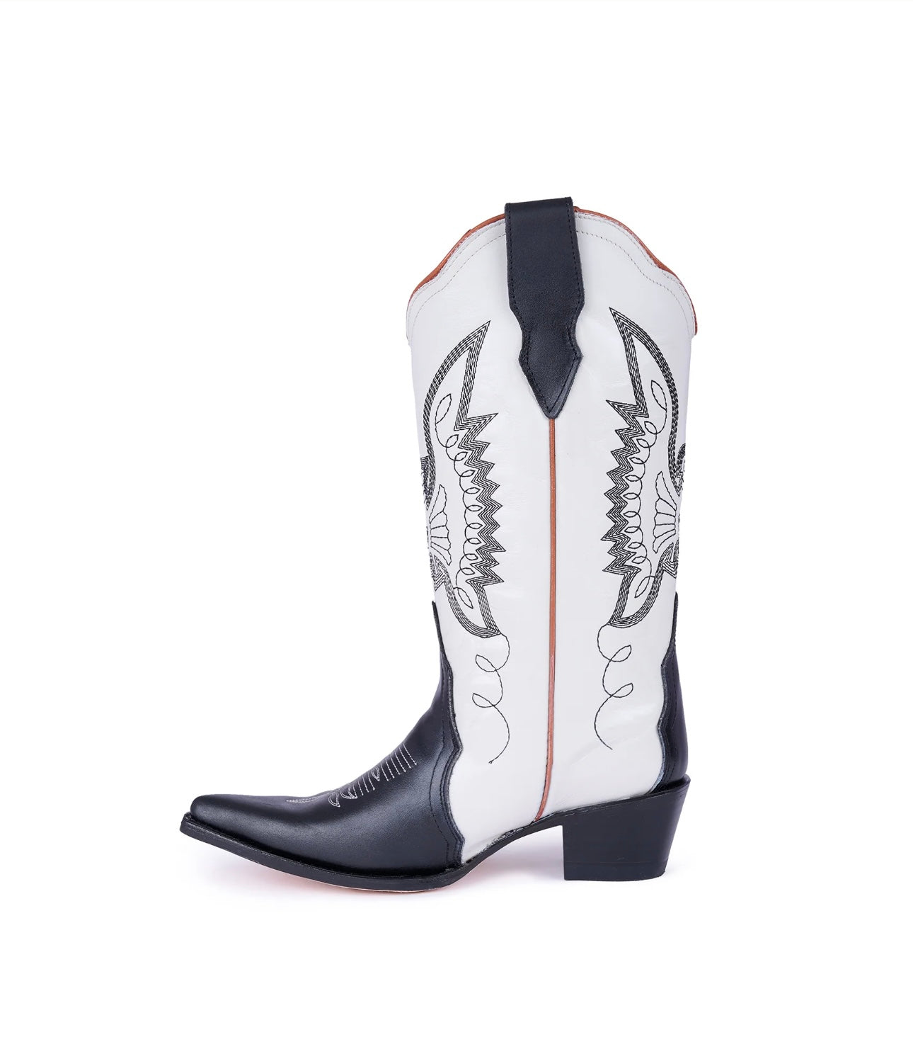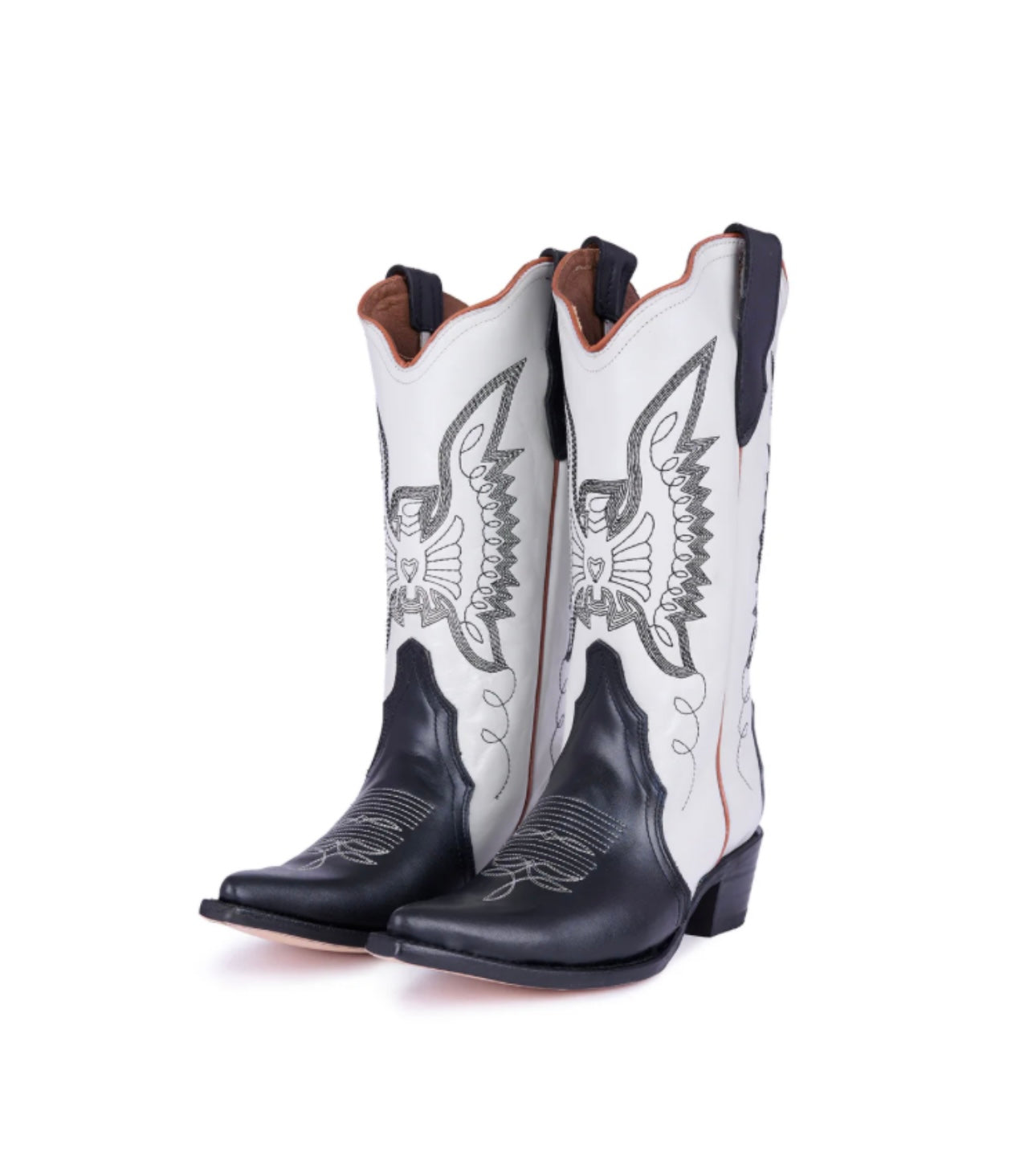 Botas vaqueras artesanales bicolor en chinela negra y tubo hueso con bordados invertidos.