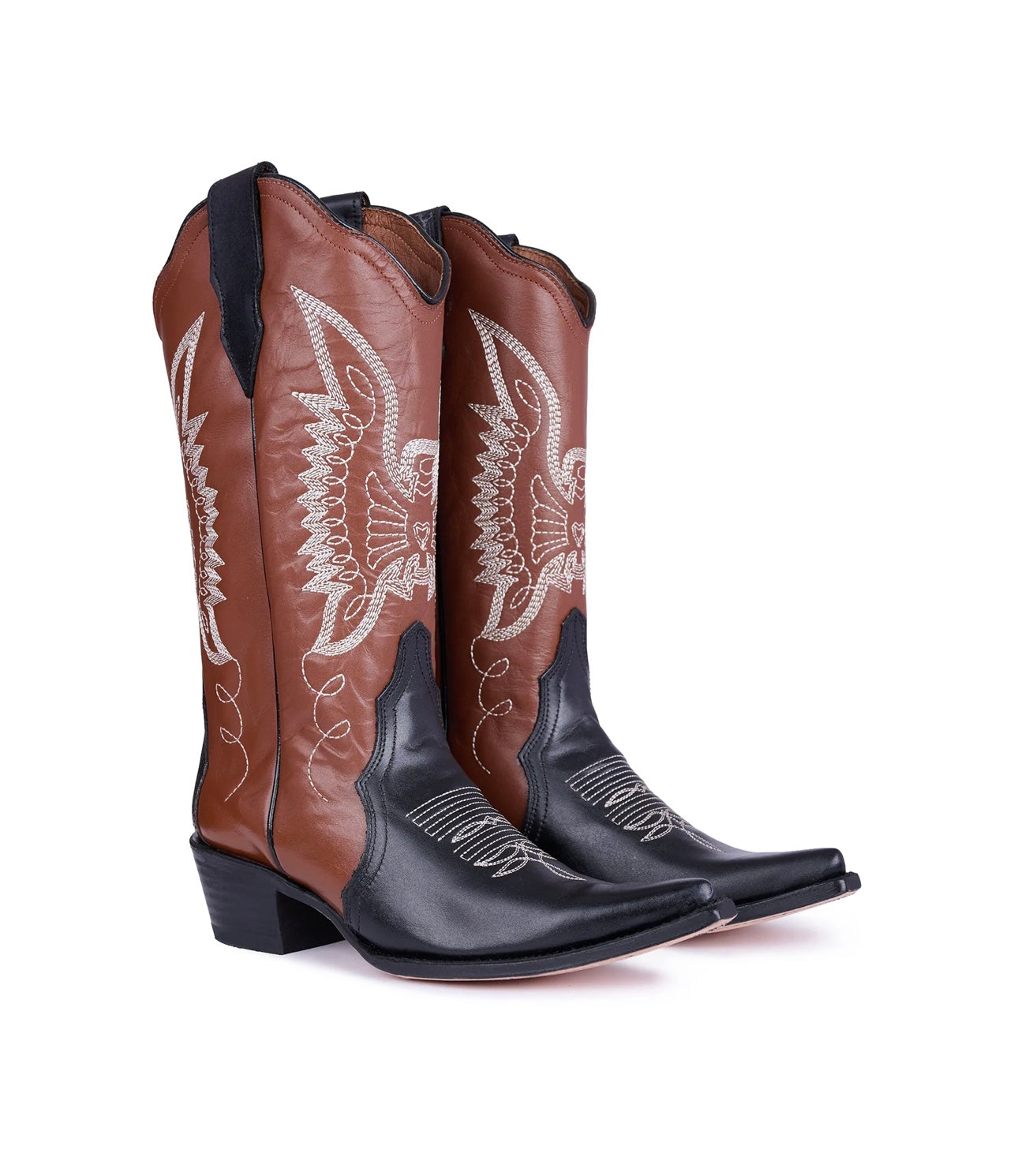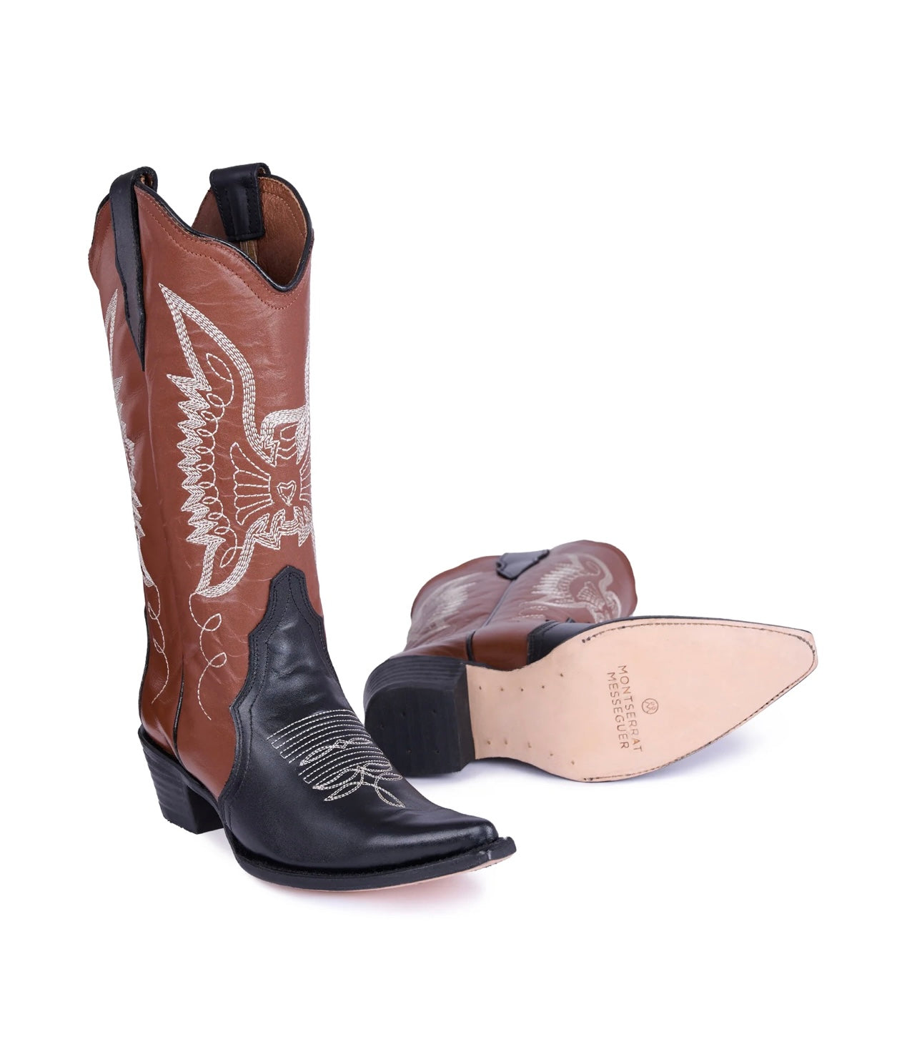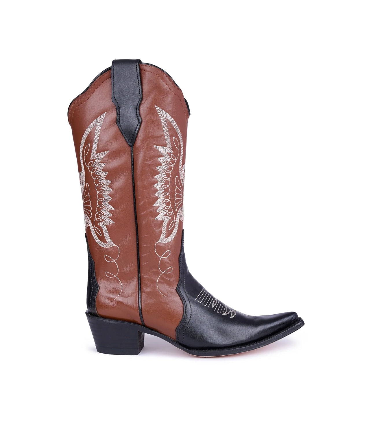 Botas vaqueras artesanales bicolor en chinela miel y tubo negro con bordados invertidos.