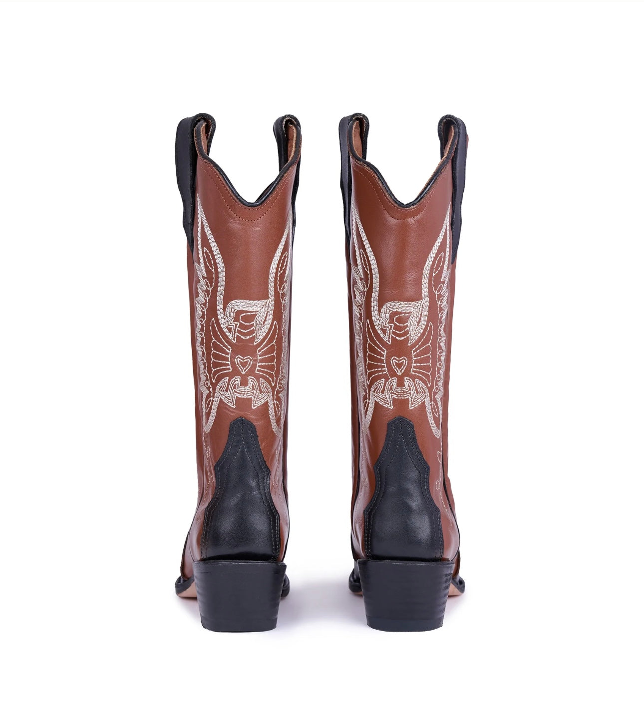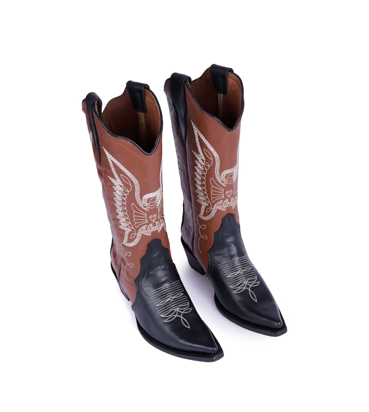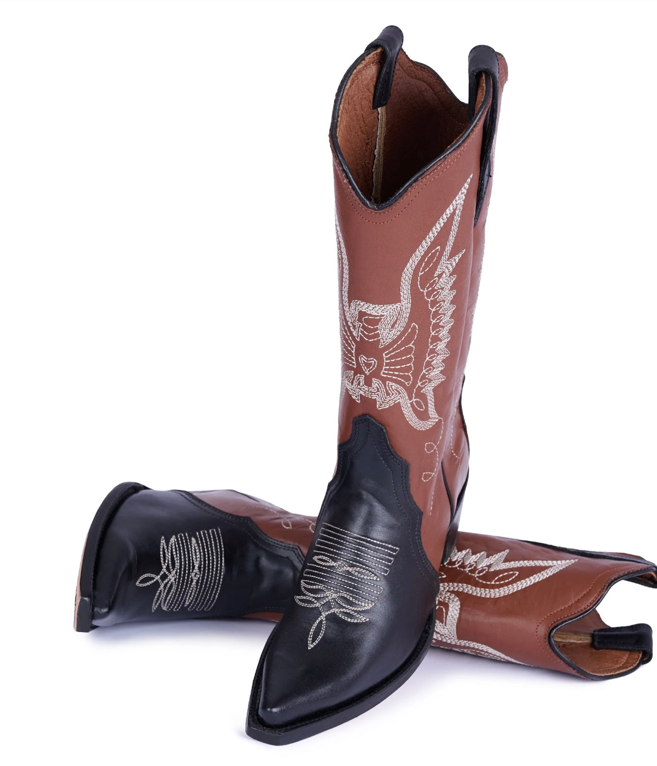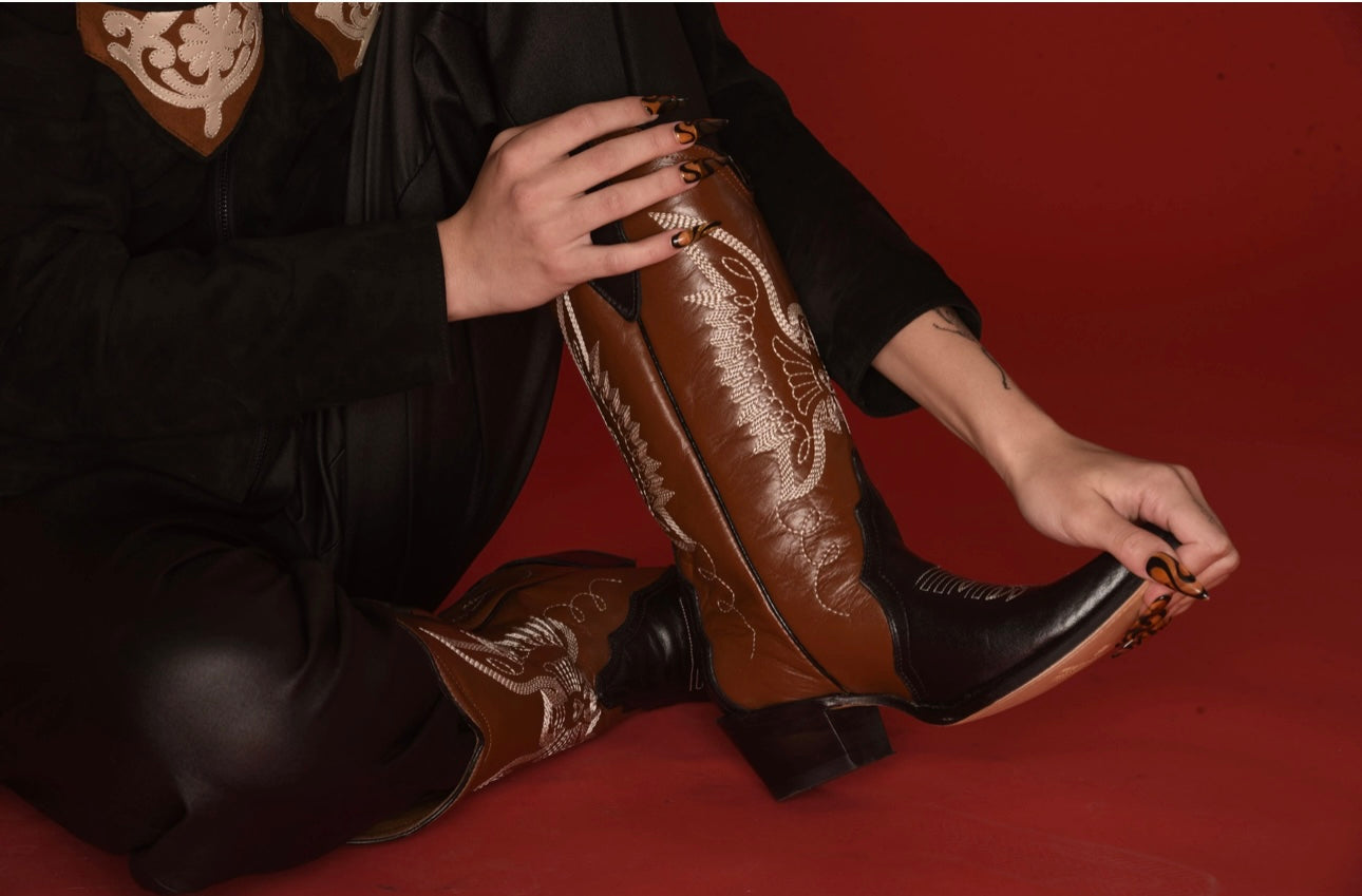 Botas vaqueras artesanales bicolor en chinela miel y tubo negro con bordados invertidos.