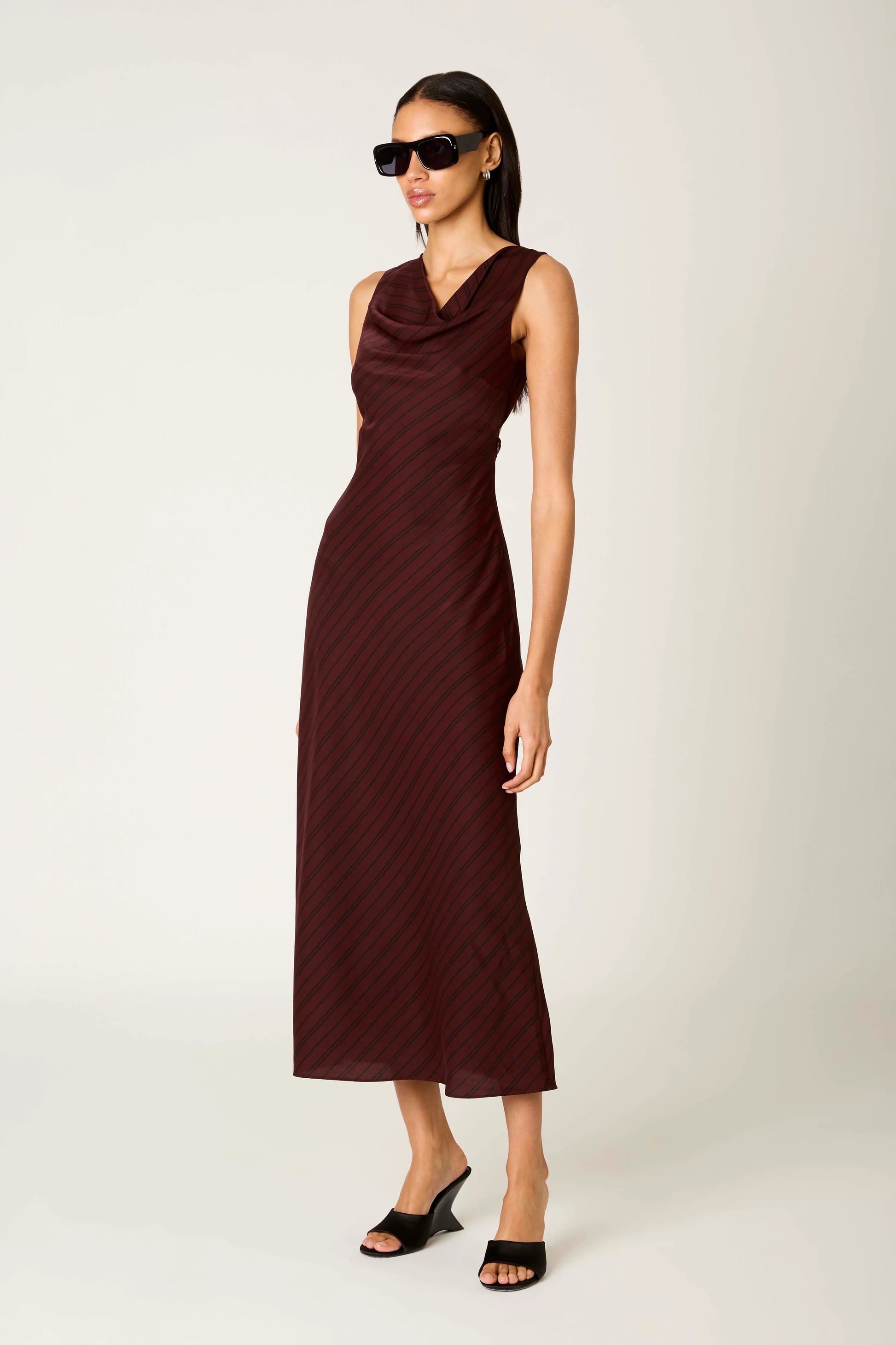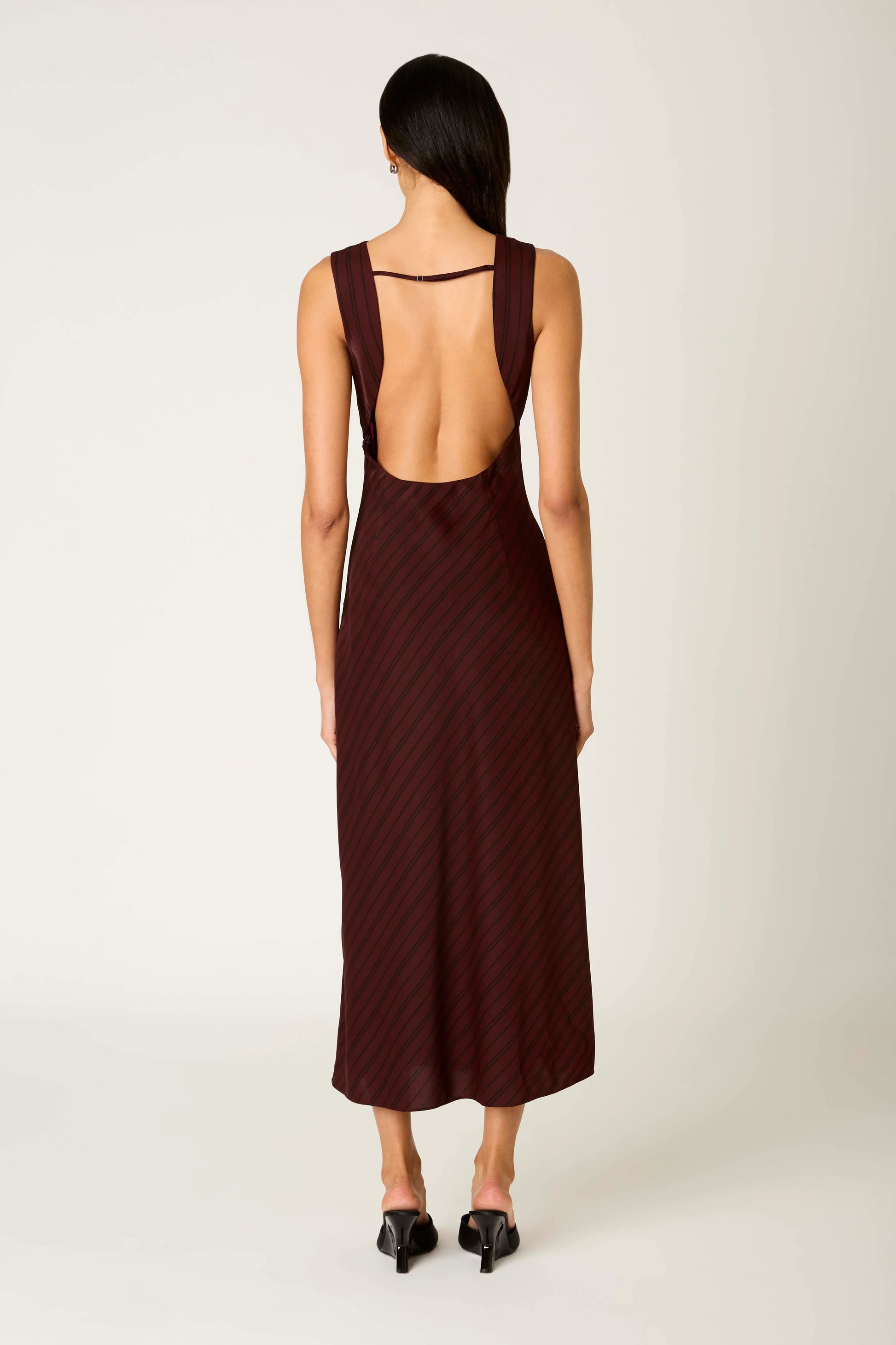 Vestido color burgundy con rayado negro en diagonal, ideal para una cena o ocasion semiformal