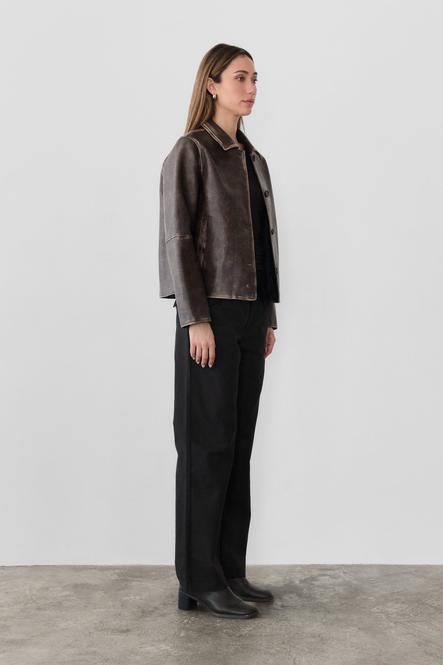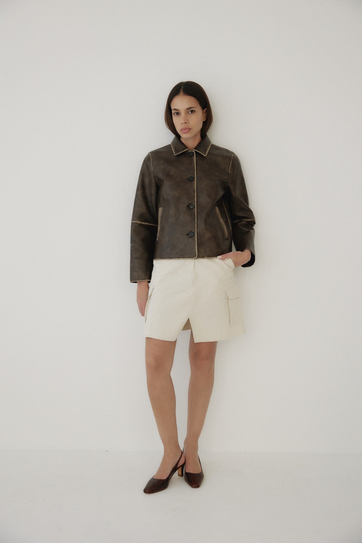 Truf Jacket es chamarra de piel con acabado desgastado y estética vintage. Diseñada con bolsillos frontales para mayor practicidad, combina un estilo edgy con funcionalidad, convirtiéndose en una prenda versátil para complementar y elevar tu clóset.